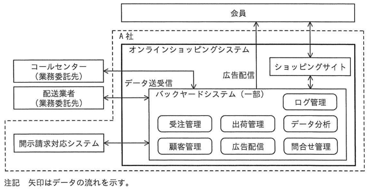 また,A社は,会員からの開示請求への適切な対応を重視し,改正法で開示などの対象とされる個人データ(以下,保有個人データという)を開示用にバックヤードシステムから抽出して構成するための開示請求対応システムを構築している。同システムのユーザーマニュアルには,バックヤードシステム内の保有個人データの保存場所,保有個人データの抽出申請手続などが記載されている。また,改正法を受けて,保有個人データ及び同データの第三者提供記録を開示用の電磁的記録(以下,開示データという)として構成する方法が追加されている。